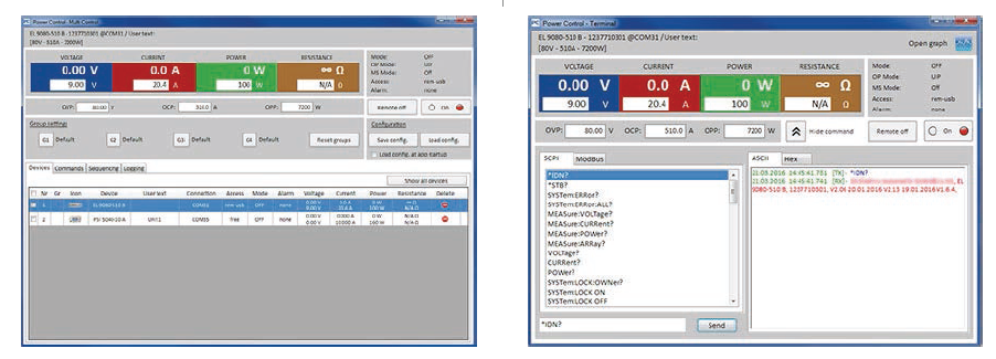 利用數字接口(USB,以太網),Windows用戶還可使用“EA Power Control”免費軟件。它具有“排序”功能,通過CSV格式的半自動化表格控制產品。此表能代表簡易的測試程序,可在MS Excel或其它CSV編輯器下創建與編寫,然后導入軟件工具內。該軟件利用“多功能控制”特性(需注冊碼,非免費),可一次性監控多達20臺產品。
