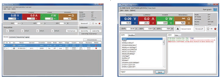 本產品還配有適合Windows系統操作的控制軟件,可遠程控制多臺同型號產品,甚至不同型號。它有一個清晰的主界面,顯示所有設定值與實際值,SCPI與ModBus RTU指令的直接輸入模式,固件升級,以及被稱為“排序”的半自動化控制表格。產品還可用注冊碼解鎖,用“多功能控制”應用在一個窗口下一次性監控多達20臺產品。此時還能使用排序與數據記錄功能。